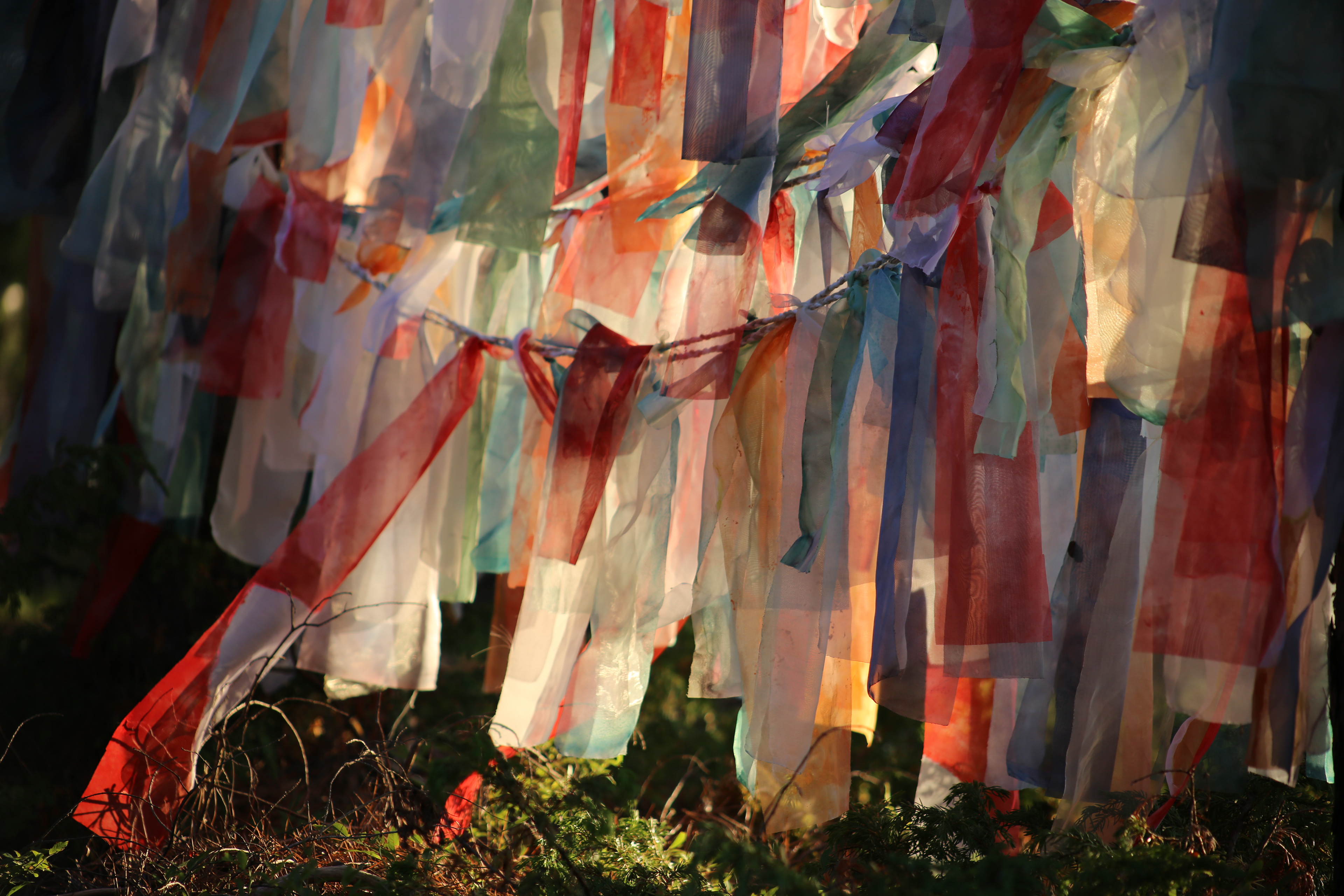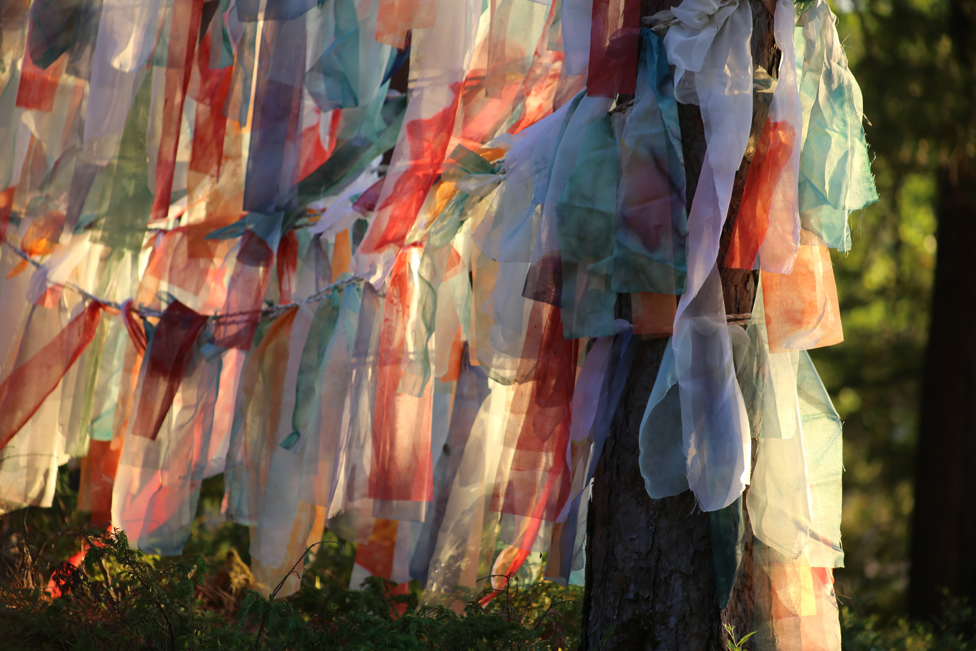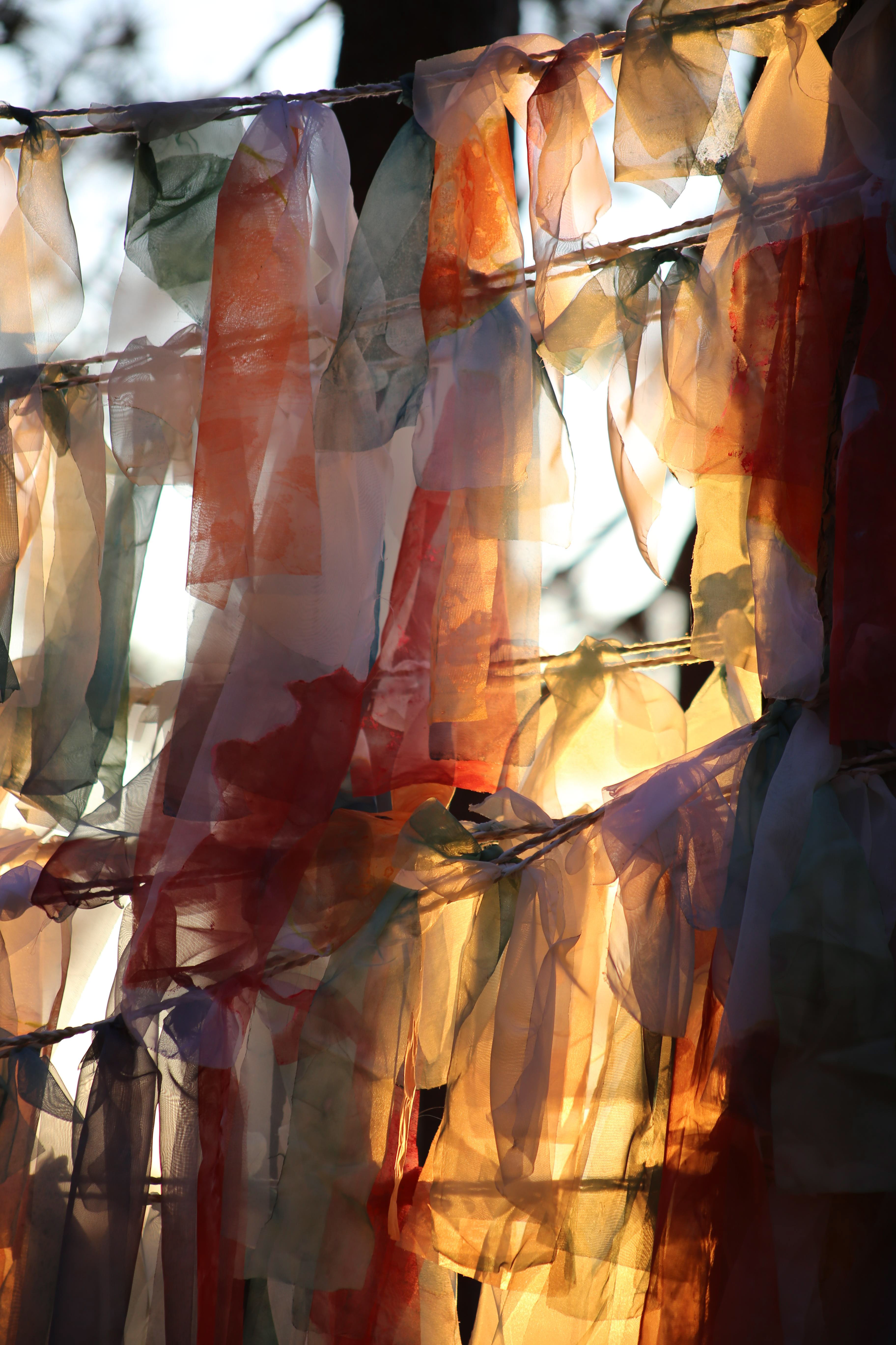 I tied individual pieces of fabric to a rope, each representing a single wish and a drop of rain.